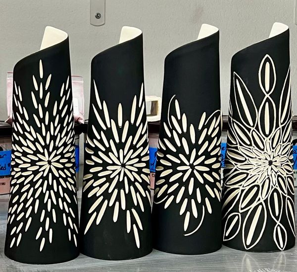 From Sandy: “I create hand built sculptural and functional porcelain artwork inspired by the beauty and resilience of nature, especially florals. My work which is increasingly feminine, reflects the delicate balance between fragility and strength, using fine porcelain to explore designs in a quiet, thoughtful way. I often use contrasting colors and metallic accents to bring out texture and depth. These details highlight the shapes and movement in each piece. My goal is to make contemporary ceramics that are both beautiful and useful—art that connects people to the natural world and invites moments of reflection.”