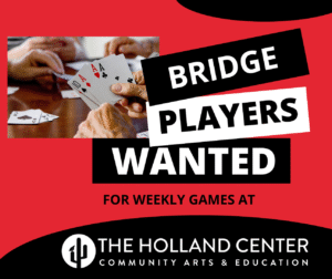 Do you love playing bridge? Looking for a way to meet new people and exercise your brain? We are looking for men and women that would love to join a weekly bridge group in the new year. If you are interested in playing here at The Holland Center, please RSVP below.