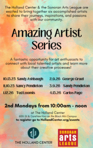 The Sonoran Arts League & The Holland Center are bringing together accomplished artists to share their journeys, inspirations, and passions with our community. This is a fantastic opportunity for art enthusiasts to connect with local talented artists and learn more about their creative processes!